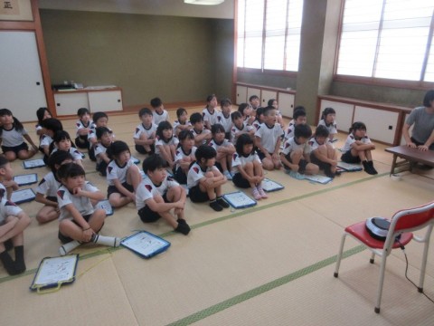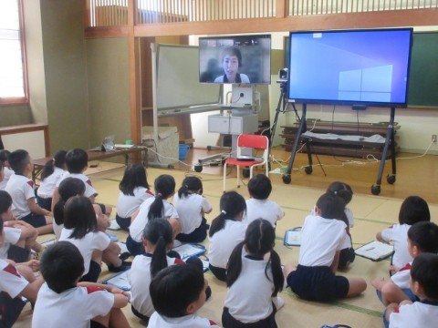 国語で「どうぶつ園のじゅうい」の単元があることから、それに合わせて行いました。説明してくださったのはアドベンチャーワールドの獣医さんです。いつもどんな仕事をしているのかなど、クイズも交えてわかりやすく教えていただきました。実際にキリンに餌を与えるところも中継で見せていただきました。オンラインだと学校にいながら世界と繋がることができますね。
