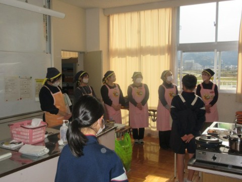 今日、町の「食いきいき隊」の6人の方に来ていただき、伝承料理教室を行いました。先日6年1組で行い、今日は2組で実施していただきました。