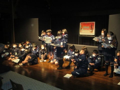 3年生はふるさと学習の取組として竹人形文楽に取り組み、9月から3ヶ月間練習を重ね、今日を迎えました。本当によく頑張りました。一つの劇を創り上げようとするとき、自分だけのことではなく、まわりのみんなのことを考えることが必要になります。みんなでやり遂げたときに喜びは数倍になります。竹人形文楽の取組を通して、一つ成長してくれたのではないでしょうか。貴重な経験の場を与えていただいた一滴文庫のみなさん、支援していただいた方々に感謝です。
