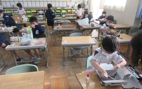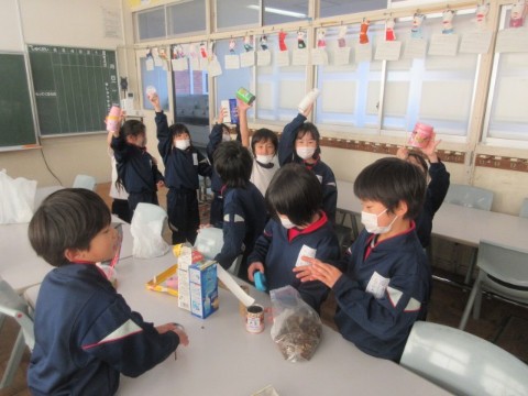 1年 見つけた秋でおもちゃづくり 公開日 2025/12/09 更新日 2025/12/09 本小日記 今日は、1年生が遠足で行った小浜公園や、校外学習で行ったきのこの森で見つけてきた秋らしいものを使って、おもちゃを作りました。 いろいろな形のどんぐり、落ち葉、松ぼっくりなどと、家から持ってきた空き箱や紙コップ、ペットボトルを使って、迷路、マラカス、バッグなどを作っていました。子どもの想像力は素晴らしいです。