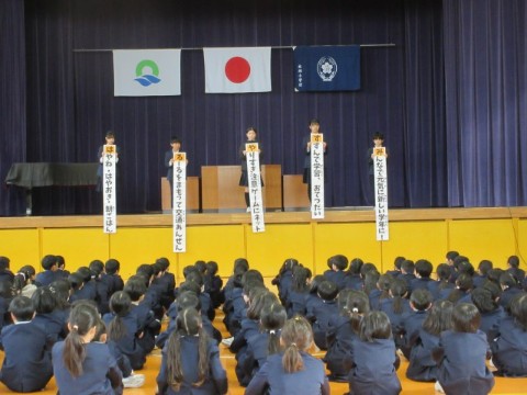 全校で、各学級のこの1年での成長を確認し合いました。担任の先生が考えた「学級のがんばったことや成長したこと」を私が発表すると、子どもたちはうれしそうな表情で聞いていました。