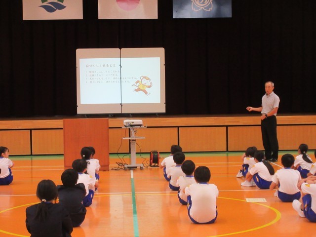 続いて、校長先生のお話がありました。校内マラソン大会に向けて、「自分らしく走るとは?」という問いかけを通して、学校目標である『自分らしく 伸び合う さぶりっ子』について考える時間となりました。児童たちは、他者と比較したり人に褒められるために頑張るのではなく、去年の自分を超えることを目標にする姿勢の大切さについて学びました。また、友達と励まし合いながら最後まで走りきること、その姿が「伸び合う」という学校目標につながるのだと、児童たちは自分たちの姿に重ねていました。児童たちは、校長先生の話を真剣に聞きながら、校内マラソン大会に向けて頑張ろうと意欲を高めている様子でした。