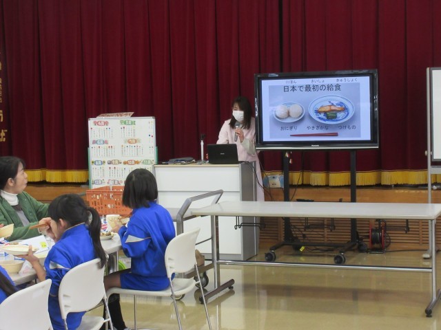 1月26日(月)~30日(金)は「給食週間」です。今日は栄養教諭から「学校給食の歴史」についてのお話を聞きました。