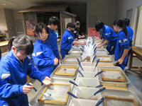 楽しかった紙すき体験 公開日 2026/02/19 更新日 2026/02/19 佐分利小学校の一日 本日(19日)、6年生が小浜の食文化館で「紙すき体験」をしました。見ていると簡単そうでしたが、実際にやってみると均等に伸ばすのが難しかったようです。子ども達は、金粉や落ち葉など思い思いの飾りを入れて、自分だけの作品を作っていました。想像した以上の仕上がりに子ども達は大満足でした。