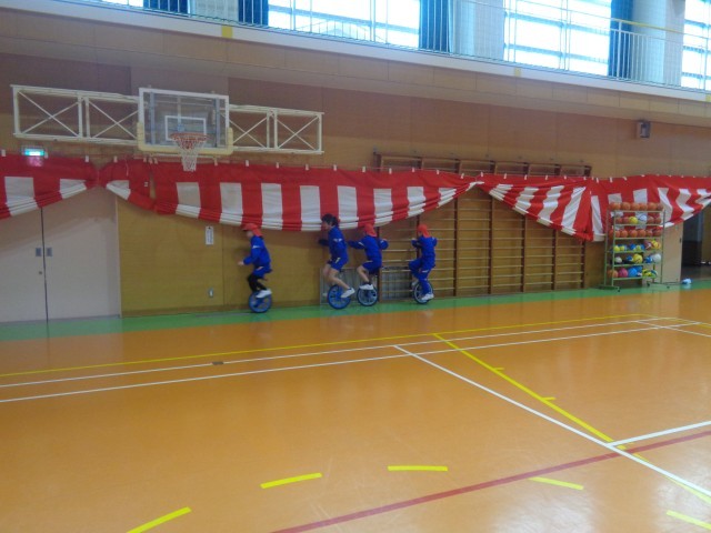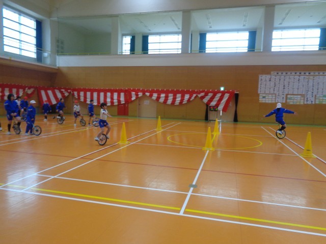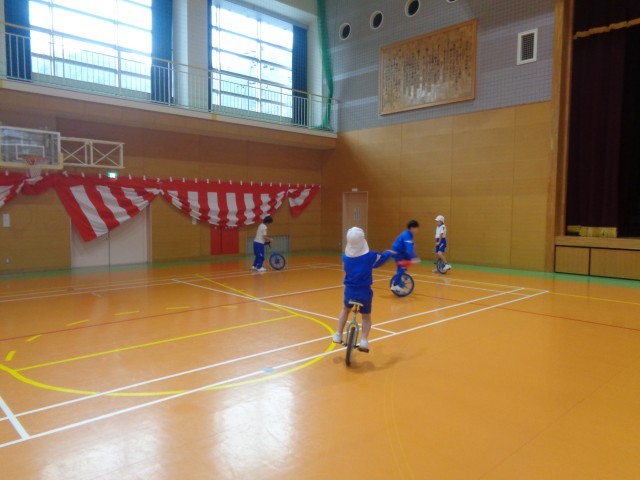 4・5年生に混じって、一輪車をレベル別に練習しました。