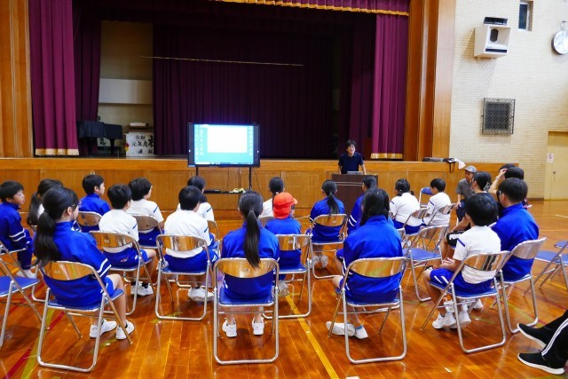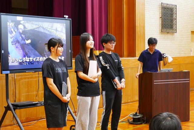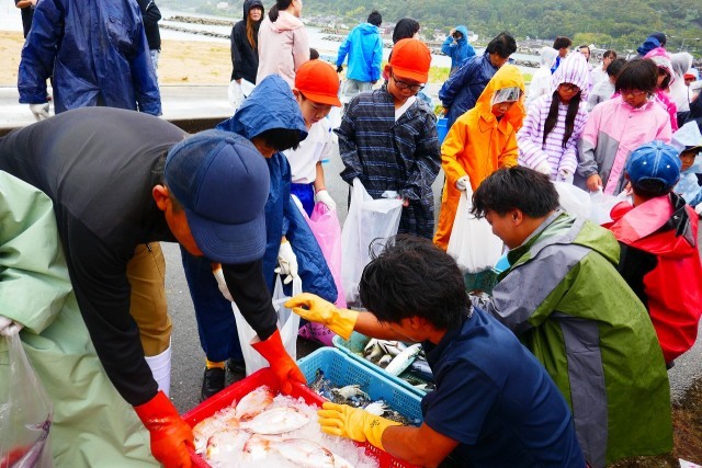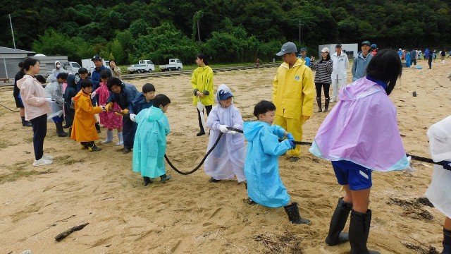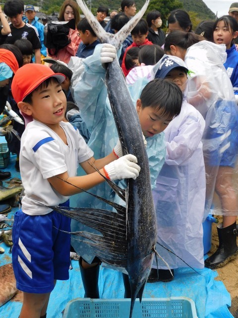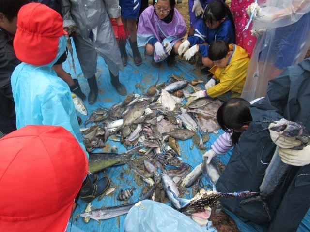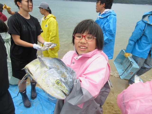 今年も実施しました!地引き網!漁協さん、漁村青年部の皆様の全面的協力により、大島小ならではの貴重な体験ができました。まずは、学校で、大島の海について学びました。藻場について、磯焼けについて、そして、大島の海を守るために立ち上がった漁師さんの取組について。児童は、身近な海の問題について、真剣に耳を傾けていました。その後、開会式を済ませて、いざ、塩浜海水浴場へ!天候が良くなかったため、漁村青年部の皆様は、すぐに網が引けるように準備をしていてくださいました。事前学習で教えていただいたことを思い出し、一生懸命網を引く児童。やがて、網が見え、中には様々な種類の魚が!大喜びの子どもたち。シイラ、バショウカジキ、ヒラメ、アオリイカ、カニ・・・本当に、たくさんの種類の魚がいました。児童は、ひとしきり魚を触って、楽しんでいました。その後は、穫れた魚をみんなで分け合い、持って帰りました。この日は、福井大学に通う学生さん3名も参加してくださり、児童と一緒に体験活動を楽しんでくださいました。天候が思わしくなく、予定変更が多かった今回の地引き網体験ですが、快く応じていただいた漁村青年部の皆様、漁協の皆様、そして保護者の皆様に心より感謝いたします。ありがとうございました。