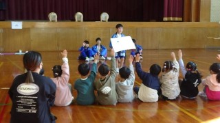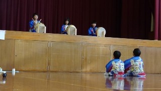 今日(20日)は、1年生と大島認定こども園の5歳児さんをお招きして、体育館で秋祭りが開催されました。主役の2年生は、これまで1年生に気づかれないようにこっそりと司会や太鼓の練習をしたり、お店のおもちゃ作りを進めてきました。