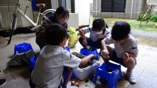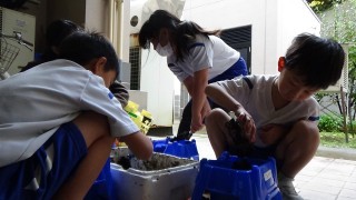 雨が降ったりやんだりする天候でしたが、小学校のポーチで楽しそうに植える姿が見られました。