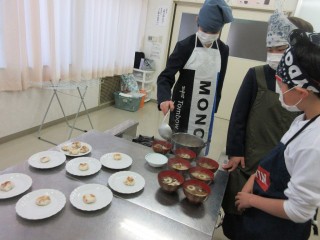 1月9日に伝承料理教室が行われました。おおい町役場の小原さん、福島さん、長濵さんにきていただき、「焼き鯖寿司」「のっぺい汁」「華供曽もち」を作って食べました。まず、材料や調理法を聞きました。独特な料理名のものが多かったので、どのようなものなのか想像しながら聞きました。次に、3つのグループに分かれて調理を始めました。長芋など食材によっては、包丁で切ることが難しそうなものがありました。また、「華供曽もち」は粘り気が強いため、混ぜるときに大きな力が必要だということもわかりました。最後にみんなで食べました。どの料理もおいしかったです。振り返りには「華供曽もちが一番おいしかった」「今回作った料理を家でも作り、家族みんなで食べたい」などがありました。昔から伝わる料理について学び、ふるさと学習にも活かしていってほしいです。
