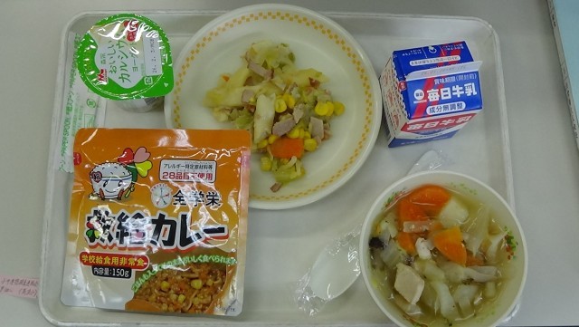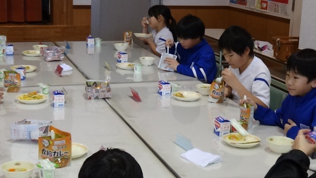 今週(21日)の給食メニューは,「非常食体験給食」でした。ご飯とカレールーが一緒に入っている「救給カレー」でした。いつどこで起こるか分からない災害時や,万が一給食センターの設備 が壊 れて、通常 の給食 を作 ることができなくなった時 に備 えて、給食 センターで買 い置 きをしているものです。