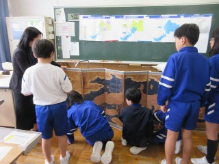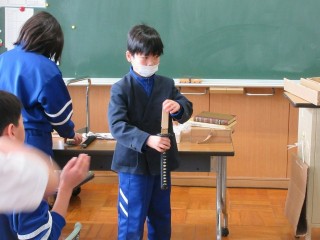 3-4年生が,図工の時間に福井県立若狭歴史博物館の学芸員の方をお招きし,博物館に収蔵されている美術品について学習しました。授業では,昔の世界地図や刀など,普段なかなか目にすることができない貴重な資料を見せていただきました。子ども達は,時代を感じる品々に興味津々の様子でした。鑑賞の後には,実際に刀を分解しながら,そのつくりや工夫について詳しく教えていただきました。普段触れることのない本物に触れる貴重な体験となりました。美術品を間近で見る機会の少ない中,子ども達は目を輝かせながら,意欲的に学習に取り組んでいました。