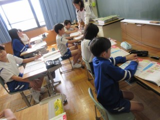 まだ少し緊張気味の5年生を6年生がリードしてくれ、授業が進んでいます。