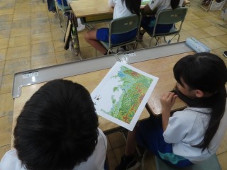 子どもたちは南川の流域を線で囲み、学校の近くを流れている水がどこから集まってきているのかを確認しました。また、名田庄を流れている水は下流の小浜では飲料水になっていることから、上流で水をきれいに保つことが大切だと考えました。県立大学の先生、ありがとうございました。
