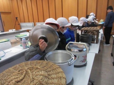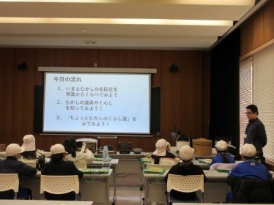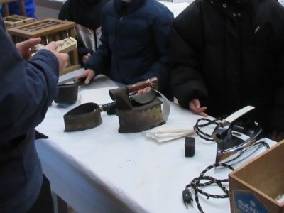 昔の暮らしや道具について教えていただきました。その後は、説明を受けながら実際の道具も触らせていただきました。昔の遊びなども少し体験し、当時の人々の生活や今と昔の違いについて、楽しく学習できる時間になりました!