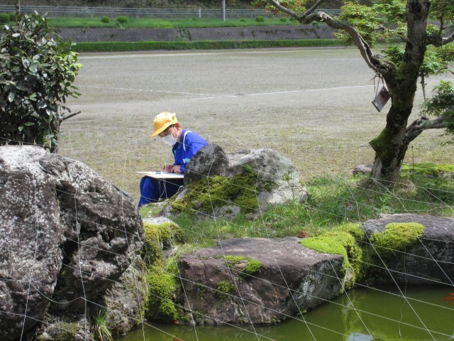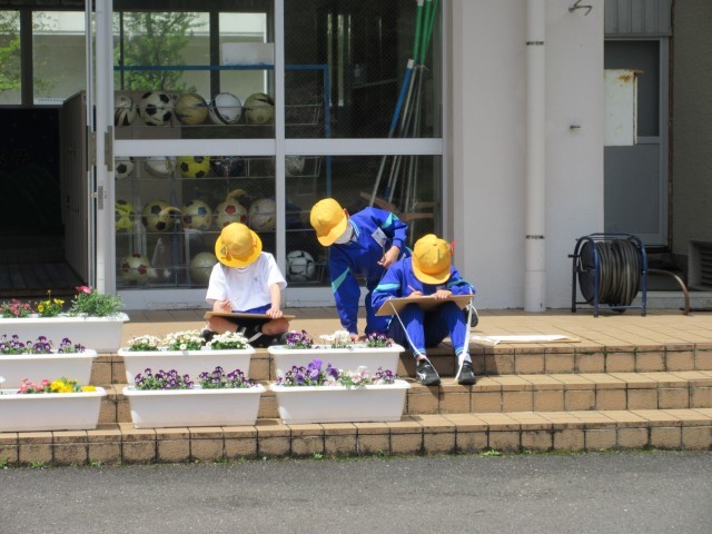 本日は天気が良く、グラウンドで写生の構図探しをしました。子どもたちはグラウンドを歩き回りながら、構図を探していました。描く場所が決まると、じっくりと観察しながら下書きをしていました。
