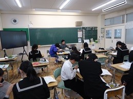 1組は英語です。「高校生になったら何のクラブに入りたいか?」について英語で会話をしていました。すぐにペアになって、どんどんしゃべり始めていました。2組は数学です。単元テスト前の勉強時間です。教科担任に質問する生徒、友達と教え合っている生徒、一人で復習している生徒など、自分に合った方法で最後の確認をしていました。3組は社会です。単元テストの真っ最中です。集中して取り組んでいました。