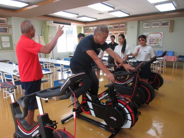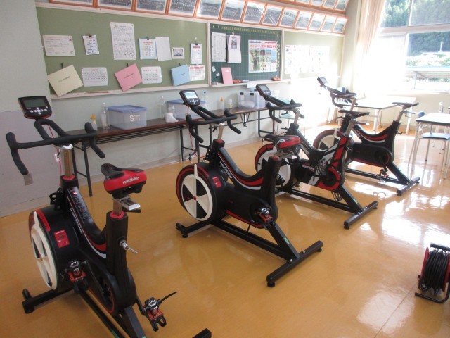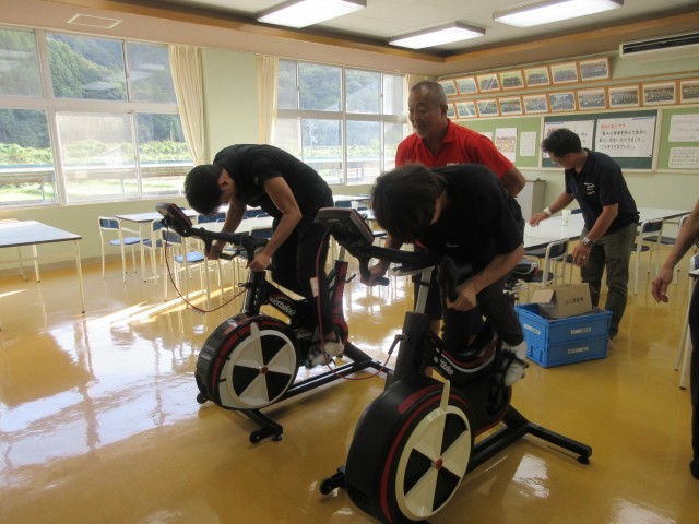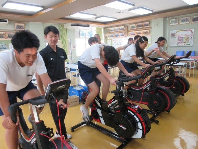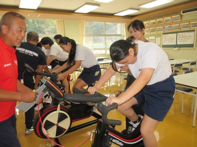 本日の放課後、県ボート協会より3名の方々が来校され、ワットバイクによる体力測定の機会を提供いただきました。