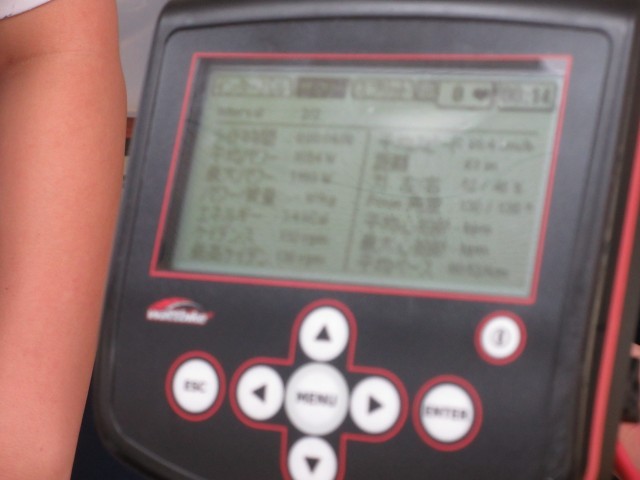 続いて行われたのが「3分間テスト」。3分間、オールアウト状態(全力出し切り)で漕ぎ続けるテストです。3分間の平均最大パワー・1時間維持できる平均パワー・最大酸素摂取量など、持久力に関する体力指標が得られるとのことです。しかし、これが相当苦しいものらしく、体力とともに根性も問われるとのことでした。挑戦し始めた生徒を見ていると、間もなく汗が噴き出てきて、次第に苦痛の表情に変わり、そして最後は悲鳴も…。見ていた協会の方や先生方からは、「がんばれ!」「まだいける!」「あと一息!」などといった声援が沸き上がっていました。