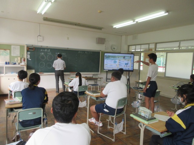 2年生の理科の授業では、植物の茎の中の「水の通り道」についての考察を進めています。前時までの授業で顕微鏡を使って様々な植物の茎中を観察した結果を、今日は各自が報告し合いました。ヒマワリ・大根・アスパラ・トウモロコシ等を調べた結果、それぞれ異なる水の通り道があったことに気づいたようです。それを身振り手振りを交えながら、相手に分かりやすく説明しようとする2年生の積極的な姿がうかがえました。