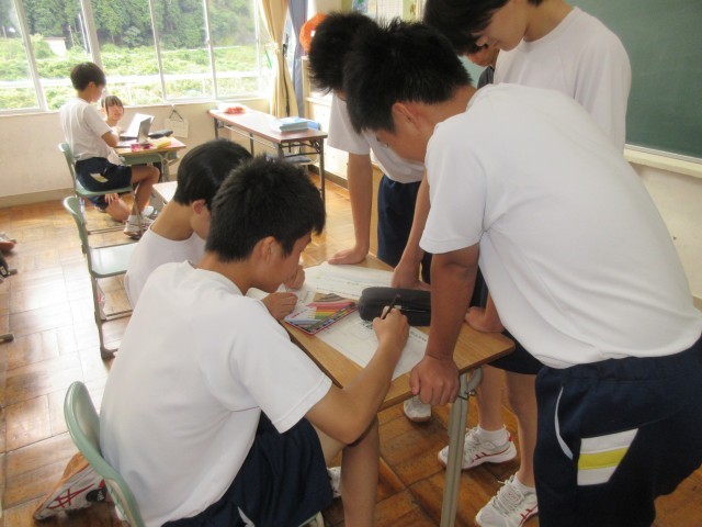 3年生の美術の授業では、「ラベルをデザイン」する学習に取り組んでいます。テーマは「名田庄地域を元気にするペットボトルラベル」づくりでした。身近な生活と結びつけた課題を提示することで、学びの必然性を生み出しています。3年生の様子を見ると…個人作業に没頭する生徒、友達とアイディアを出し合いながら協働して制作に取り組む生徒など様々ですが、みんなやる気満々です。ワークシートに手描きで挑戦する生徒もいますが、やはりタブレット端末上のアプリケーションソフトを活用して創意あふれるグラフィックデザインを表現する生徒がたくさんいました。