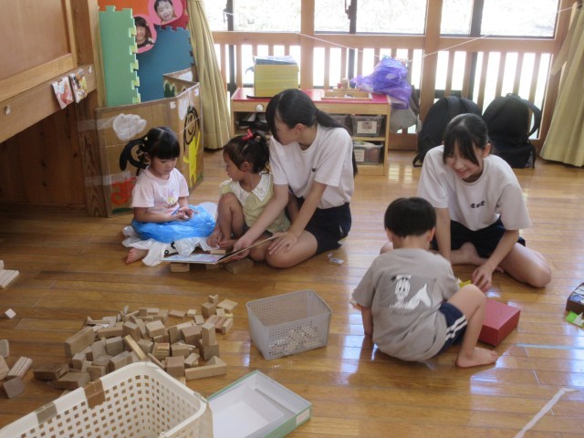 最初に遊戯場にて園児を前に3年生から挨拶をした後、3~5歳児の各教室へとグループごとに移動。園児とのふれあい体験に臨みました。