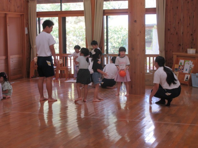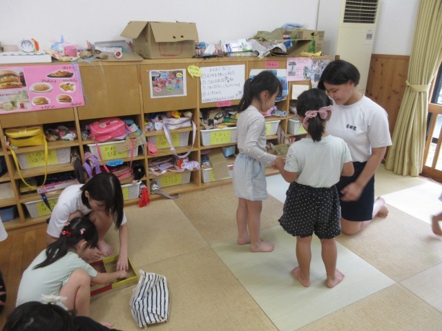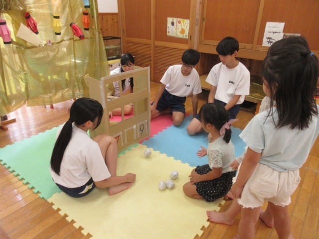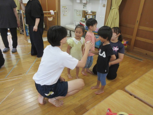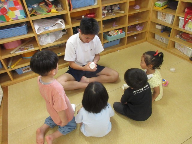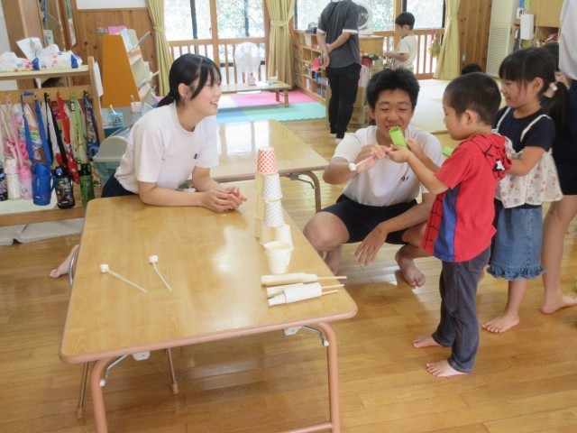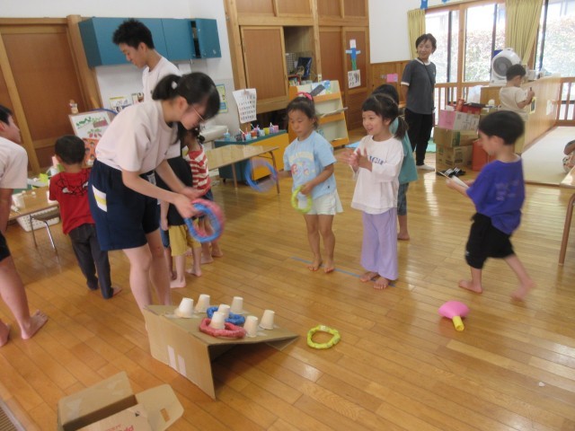 3歳児にはお手玉や糸電話・台上紙相撲などを、4歳児には輪投げや的当て鉄砲などを、そして5歳児にはビー玉迷路やパチンコゲーム・ストラックアウトなどをそれぞれ準備(他にもたくさんのおもちゃが準備されていました)し、園児と一緒になって遊びました。仲良く遊んでくれるお兄さん・お姉さんがいることが園児にとってはたいへんうれしかったようで、すぐに懐いていました。