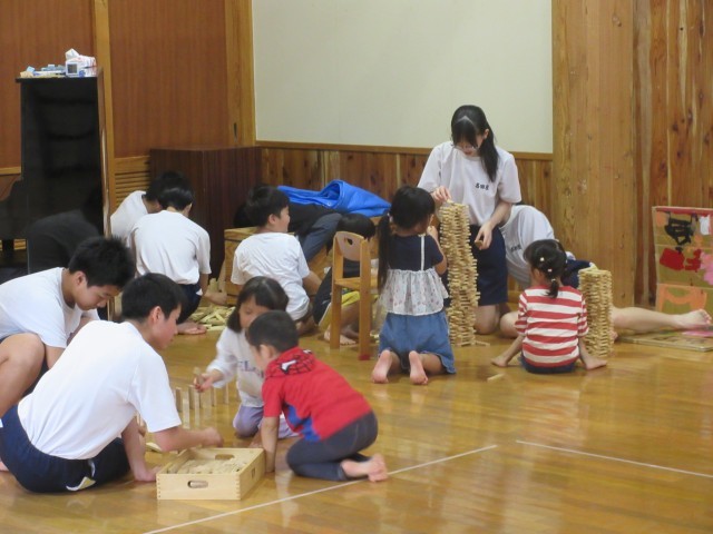 体を動かす遊びの時間になると、園児に誘われて3年生も一緒に遊戯場へ。ボール・フラフープ・ミニ平均台などを使って遊んだり、木の板を使った積み上げゲームやドミノ倒しに挑戦したりして楽しんでいました。ここまでくると、3年生も園児とすっかり打ち解け合い、手をつないだり抱っこしたりと仲睦まじい光景を見ることができました。
