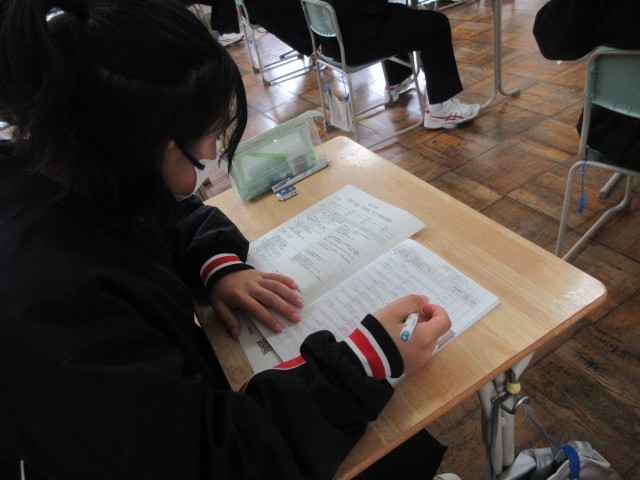 テスト前の待機教室にある机の上には、3年生が繰り返し取り組んだ問題集や自分でまとめたノートなどが置かれており、このテストに向けて努力を積み重ねてきたであろうことがよく分かりました。学力診断テストを終えた3年生一人一人に、ひとまず労いの言葉をかけたいと思います。