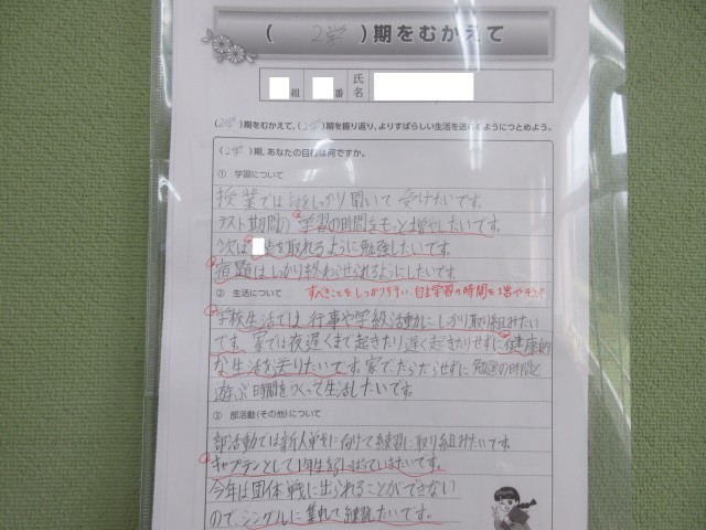 今日は「願生って」期末テストまでの勉強計画表を作成した2年生の皆さん。計画は早めに実行すれば「貯金」ができます。いつから始めるとよいでしょうか…「今でしょ」!