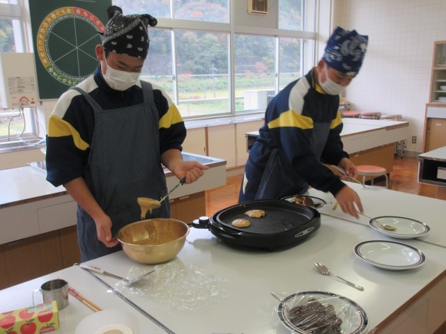 最後は、「胃袋つかもうグループ」。地元特産の自然薯と梅を取り入れた「どら焼き」の商品化を目指しています。今日の活動では、皮の焼き具合や梅の量などに着目して試作品の改良を試みました。職員室の先生方にも試食いただき、率直な意見をいただくなど積極的に活動する本グループ。この飽くなき向上心は必ずや実を結ぶものと信じています。今後はこの創作どら焼きのレシピを完成させ、商品化に賛同いただく業者に提案することが大きな課題となりそうです。探究の道のりはまだまだ続くものと思われますが、このグループのチャレンジ精神は大いに評価できます。