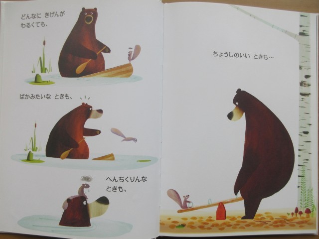 今回の内容は、大きなクマと小さなリスの友情物語。クマは、リスがどこへ行こうと何をしようと必ずそばにいることを伝えます。調子の良い時も悪い時も…。だからクマとリスは、お互いできないことができるようになるほど仲良しでした。そんなある日、リスはクマと離れて初めて気づきます。「 … さびしい、クマのいないのが! 」