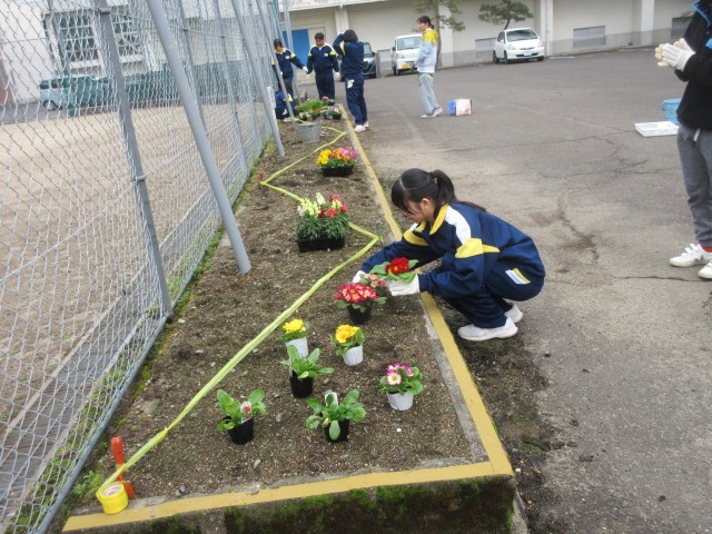 まずは花壇全体を見渡し、「バランス良く植えること」と「彩り豊かに見せること」の2つに気を配り、全ての花苗ポットを仮置きしていきました。「きれいに見せるようにがんばろ!」と意気込む生徒あり、「この色の花はそこの花の色と似ているから近くにしよ!」と熟考しながら作業する生徒あり、「あまり端っこすぎるとダメですよね…」と試行錯誤する生徒あり。取り組み方は様々ですが、丁寧かつ一生懸命な姿勢はどの生徒も同じ。美化委員としての使命に燃える姿に感心しつつ、互いに協力しながら和気あいあいと活動する様子を見ていて心温まる思いがしました。