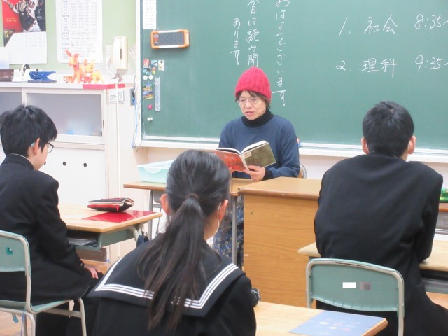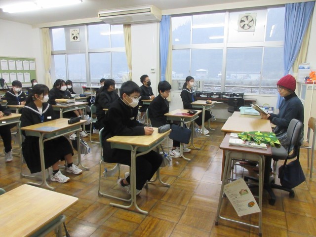 今回の読み聞かせですが、いつものような絵本ではなく単行本を持参いただきました。初めにボランティアさんから「耳でしっかり聞き取りながらイメージしてくださいね」との言葉が1年生にかけられました。心もちいつもよりゆっくり、しっとり読んでいただいたこともあり、1年生は視線をやや下に向け、耳を傾けるが如く聞き入っていました。「聞く(聴く)力」を高めるチャンスになったかもしれません。近隣中学校が目標に掲げる「アクティブな聴き方」を本校生徒もぜひ身につけてもらいたいと思っていただけに、そのきっかけともなる読み聞かせとなりました。願ったり叶ったりです。