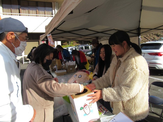 当日(11/23:日)は参加できる有志メンバーが会場に集合し、事前に承諾を得てあった設営テント内にて「じ~ちゃん」グッズプレゼントコーナーを設置しました。続々と来場するお客さんに2年生メンバーも思い切って声をかけてみますが…やはりお客さんのお目当ては採れたばかりの新鮮な自然薯。早い者勝ちということでそちらに足を運ぶ方が多かったようです。それでもしばらくすると、地元中学生の奮闘ぶりに興味をもったお客さんが次々と立ち寄ってくれるようになりました。