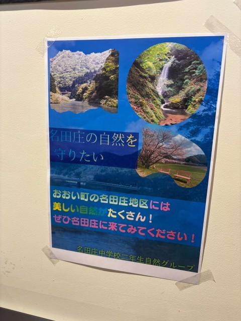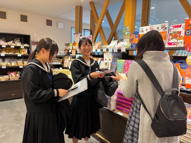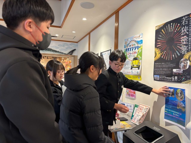 次に「自然グループ」。名田庄地区自然マップを作成した本グループは、先週金曜日(12/5)に「道の駅若狭おばま」に出向いての校外活動を実施しました。事前に準備したのは、掲示用PRポスターと来客者に配付するためのイラストマップ(アンケート入り)。当日は、これらを活用して地域が誇る美しい自然環境をPRしたり、環境保全活動への協力を求めたりする活動を行いました。平日でしたが、お客さんの出入りはけっこうあったため、一人一人に声をかけてはPR活動に取り組みました。関心を示すお客さんに笑顔で対応するなど、メンバーも活動の手応えを感じることができたようです。