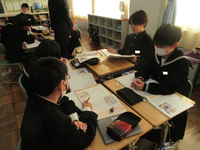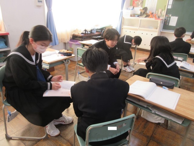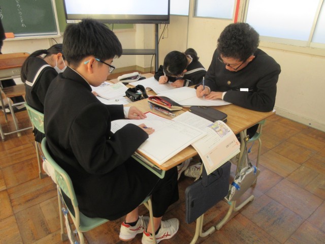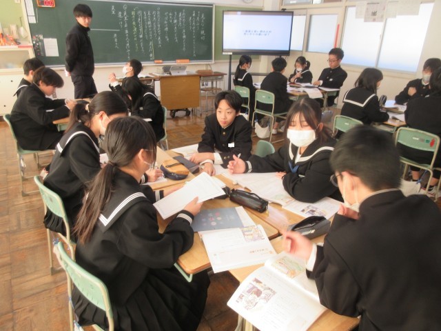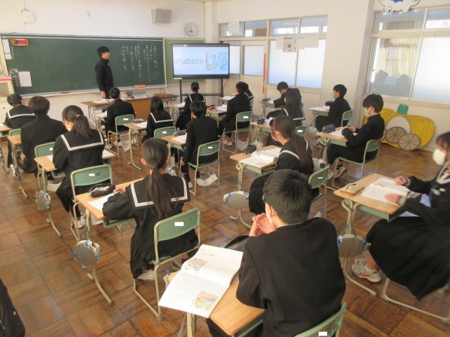 同じ席を譲る行為でも、美里と若い男性とではどんな違いがあるのか…1年生は二人の行動が示す思いやりの形についてじっくりと考え、友達と語り合いました。それぞれ美里と若い男性のどちらの行動・姿により共感し、「自分もこうありたい」という願いを持ったでしょうか。「美里のようにはっきり言葉で伝えないと、相手に思いやりの気持ちが伝わらないのではないか」「美里と違って男性は相手から感謝されたいという思いがなかったのではないか」など、生徒なりに思考を深める言葉がよく聞こえてきました。「考え、議論する道徳」の授業へと進んでいく過程がよく分かりました。「見える親切」と「見えない親切」…どちらにより高い価値を感じるでしょうか。もう少し時間があれば、さらなる議論の深まりにつながったことでしょう。