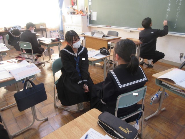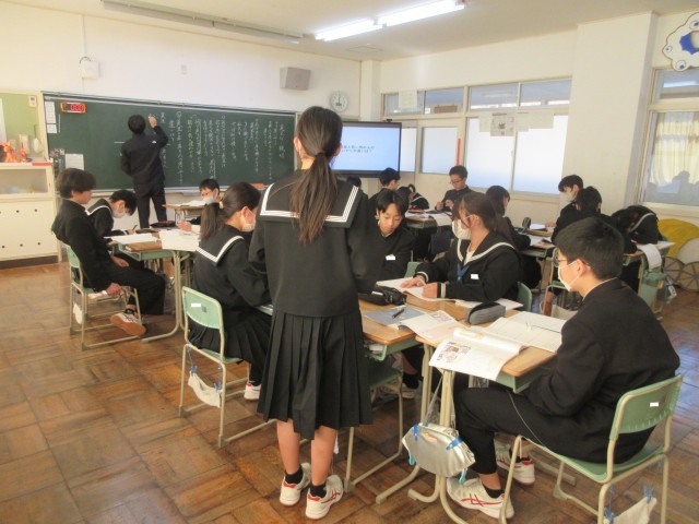 ちなみに、1年生の皆さんが「思いやり」を感じたのはどんなときか。「部活動の大会でお守りを渡されて励まされたとき」「給食当番をしていて用務員さんに『ありがとう』と言われたとき」「給食準備が遅れたとき、みんなが何も言わずに待っていてくれたとき」…。やはり「見える」ものもあれば、「見えない」ものもあるようです。このように「親切・思いやり」の行動にも様々な形があり、いずれの価値も認めることで、今後の自身の生活をより豊かにしていく…そんな1年生の姿が今後は期待できるのではないかと思います。