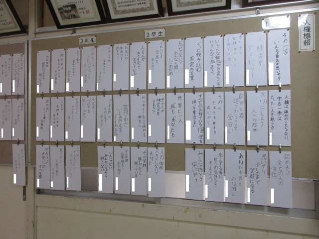 今日で人権週間は終わりますが、今日こそ改めて人権尊重(互いの立場を認め合い、尊重し合う)の精神を大切にして学校生活をリスタートさせる吉日と言えるでしょう。生徒玄関前廊下の掲示板に掲げられた全校生徒の「人権標語」が輝いて見えます。