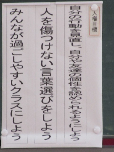1年生の人権目標は「自分の行動を見直し、自分や友達の個性を認められるようにしよう」。