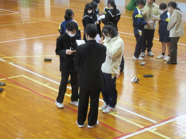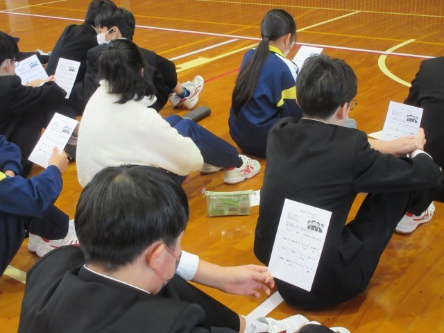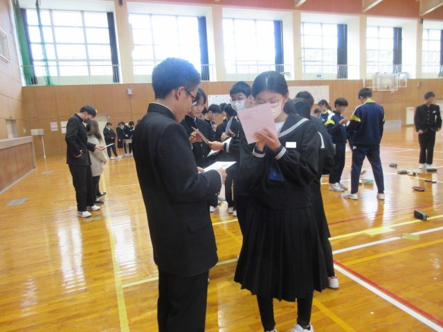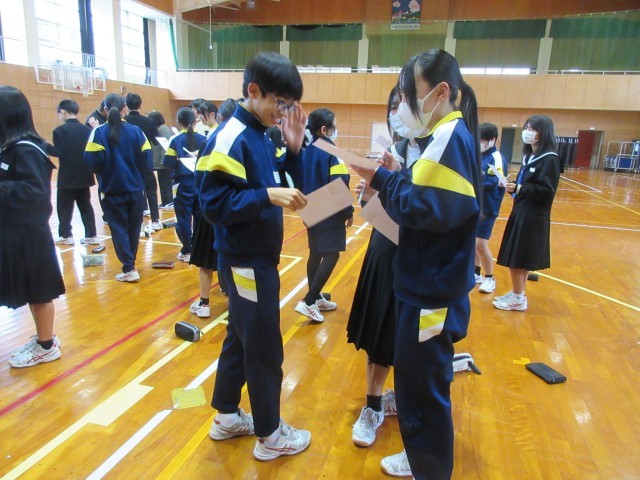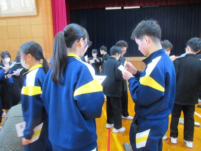 最初は同じ学年・同性の友達とのやりとりが続いていましたが、司会進行を務める学級委員さんが「ちがう学年の人にも声をかけましょう!」 「男女関係なく、お互い積極的に声をかけ合いましょう!」など、臨機応変にアナウンスすると会場全体の動きが活性化。先生方にも声をかけ始める生徒が出てきました。やりとりする生徒の表情はやはり柔らかいです。自分の良さに目を向けて声をかけてくれる同級生・先輩・後輩がいるということは、誰にとってもうれしいことでしょう。承認欲求が満たされたり、自己肯定感が高まったり…そんな心地よい時間になったのではないでしょうか。何より学年・男女の枠を越えてコミュニケーションを図る全校生徒の様子を見ていて、たいへん心が温まりました。