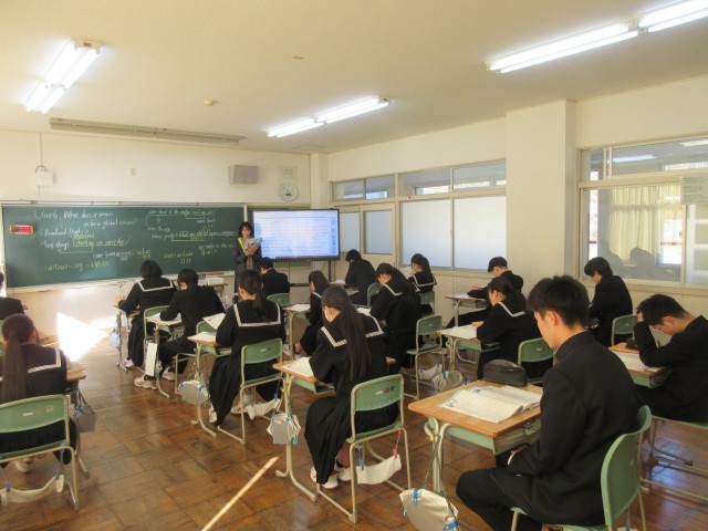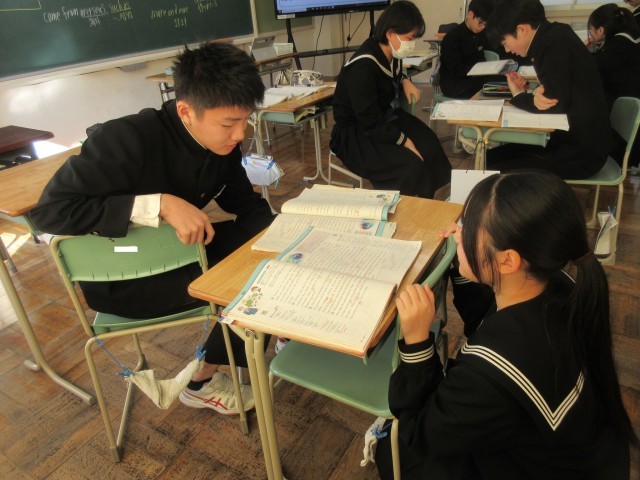 3年生は英語の授業で「関係代名詞」を用いた英文の学習に取り組んでいました。「ピリッ」と引き締まった雰囲気の中でも、ペア学習になると笑顔でコミュニケーションを交わすことができるのがこのクラスの良さです。今日も全員で音読する時の声がステキでした。