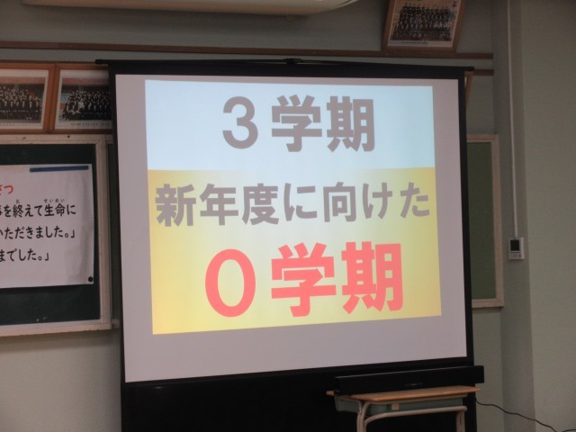 校長講話では、3学期は来年4月から始まる新たな学年・学校生活に向けての準備を整える「0学期」と捉えてもらいたい…との思いを伝え、2学期同様に各学年へエールの合言葉を送りました。