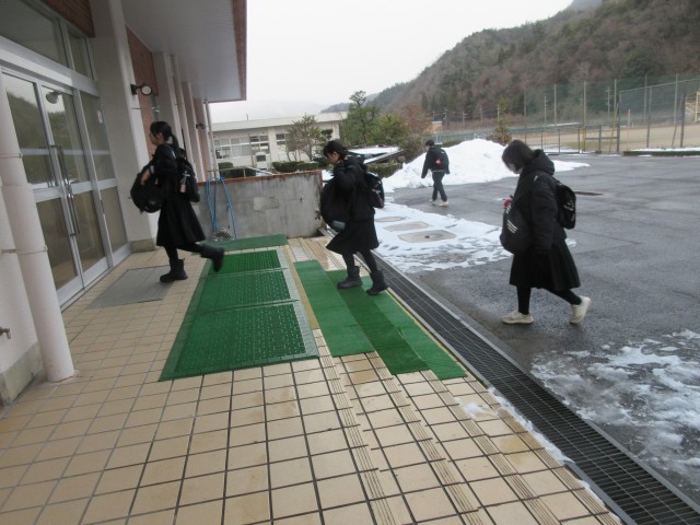連休中の降雪により学校敷地内にも雪が積もりましたが、地域の方に除雪いただいていたこともあり、生徒玄関前はすっきりとしています。