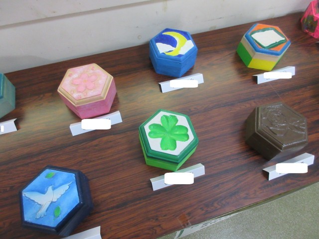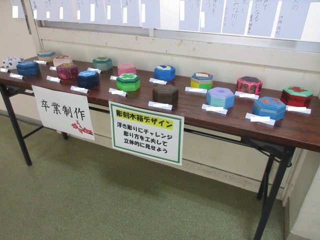 さて、生徒玄関から校舎内に入った先の廊下には、現在、生徒作品が展示されています。3年生が美術の授業で取り組んだ卒業制作品「彫刻木箱」です。彫刻刀を使って彫り方を工夫することで、表面の図柄を立体的に見せるようデザインされている…はずです。