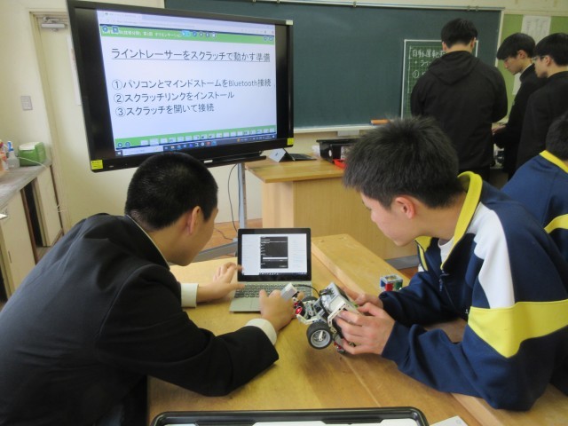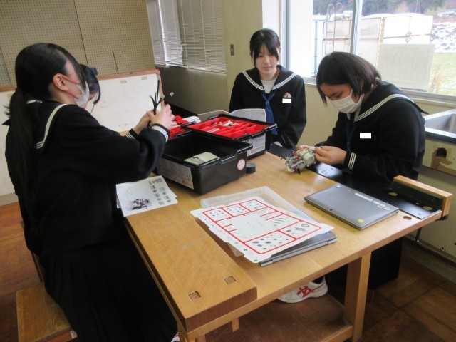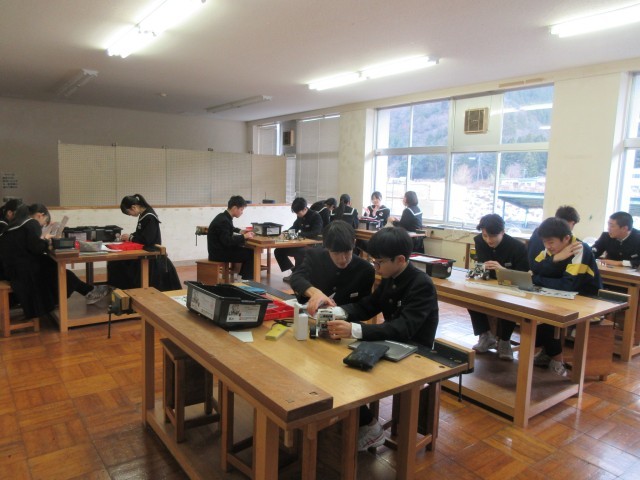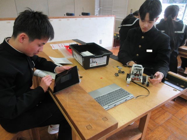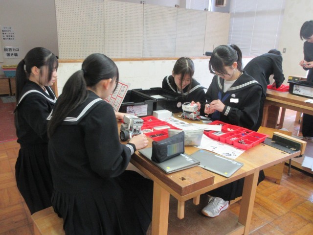 並べられた作品を眺めていると、その生徒の顔が浮かんできます。取り組み始めた当初、頭をひねってデザイン考案に努めていた姿が目に映ります。完成目指して一生懸命取り組んでいた姿も思い起こされます。出来上がった際には友達同士で鑑賞し合いながら、笑顔で言葉を交わしていたであろう様子も想像できます。今日の5限目の技術の授業では、プログラミング学習の一環としてペアでの製作・演習活動に取り組んでいましたが、そこでも3年生のそうした姿を見ることができました。