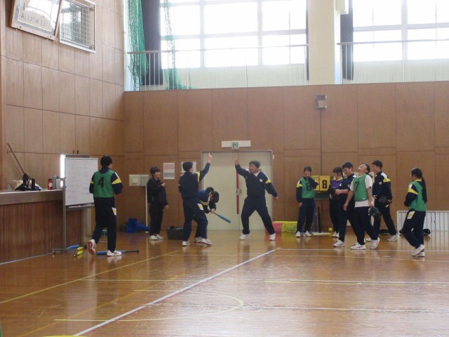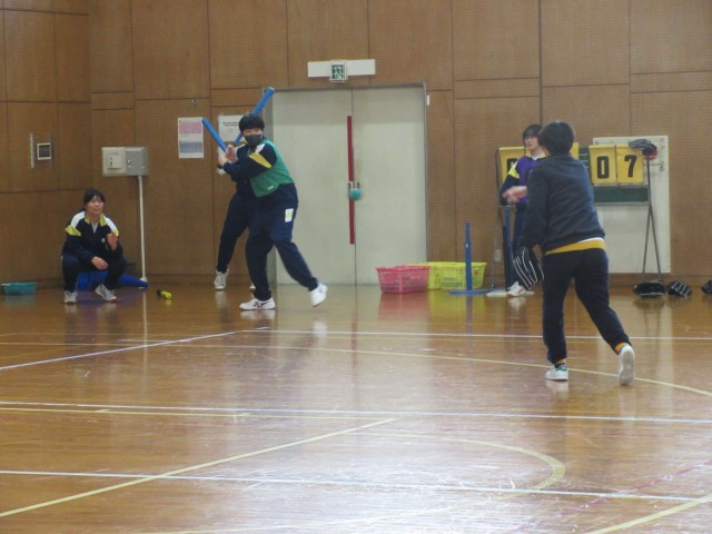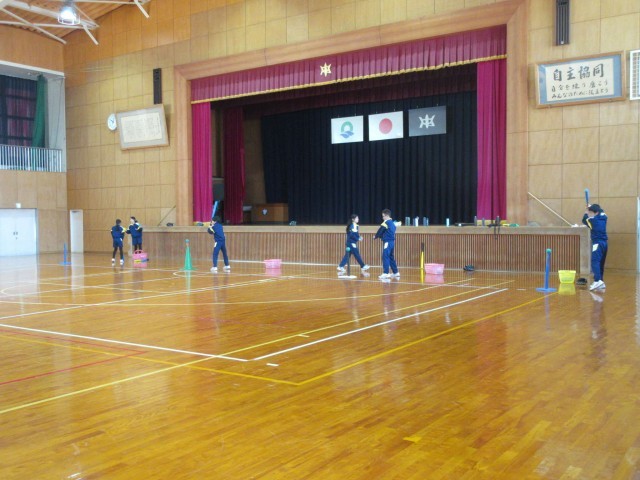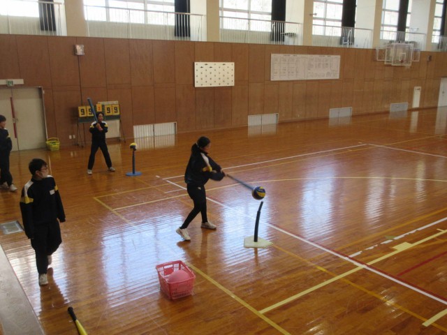 2限目は、1年生がソフトボールのバッティング基本練習に取り組みました。初めはティーボール用ゴムバットを短く持ってソフトボール大のゴムボールをリフティングする練習。続いてバッティングティーを使ってバレーボールサイズの大ボールをヒッティングする練習。最後は、ソフトボール大のゴムボールをティーに置いてヒッティングする練習…というように、スモールステップを踏んで段階的に活動レベルを上げていきました。軟式野球部に所属している男子生徒は、体育館2階のギャラリーへとボールを放り込む場面が何度も見られました。一方、女子生徒の中にも男子に負けじと2階ギャラリーまでかっ飛ばす生徒も。思い切ってバットを振る爽快感と、勢いよくボールが飛んだときの心地よさに存分に味わうことができたようです。