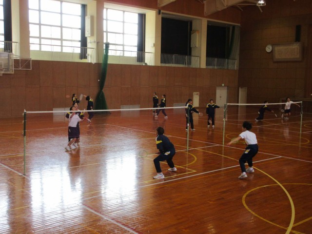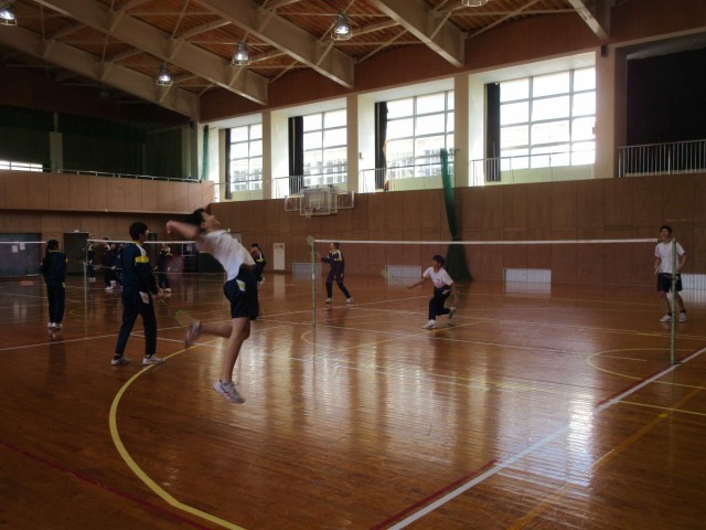 4限目は、3年生がバドミントンのゲーム(ダブルス)を行いました。初めの練習タイムでは、どのコートでも穏やかなラリーが見られましたが、ゲームに入ると雰囲気が一変。真剣モードに入りました。男子の中にはジャンピングスマッシュを放つ生徒がいるなど、レベルの高い攻防も見られました。当然ミスする場面もありますが、仲間を責めることはありません。一生懸命取り組む中にも、笑顔あり、笑いあり、喜びあり、悔しさあり…。勝利を目指しつつも、仲間とともに楽しい時間を過ごすことができたようです。