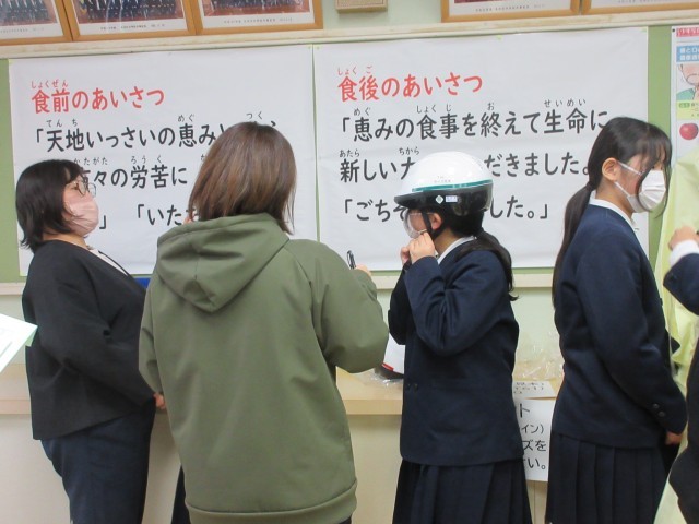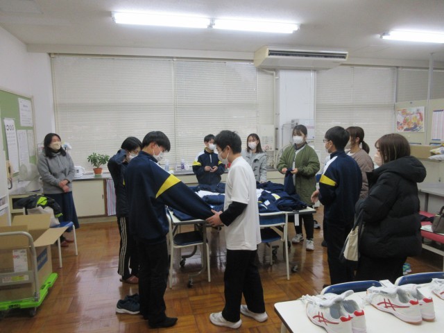 最後に、入学までに購入して準備しておくものについて説明。その後、同会場にて自転車用ヘルメット・カッパの試着、別室(保健室)にて体操服・内履きシューズの試着(試し履き)をし、サイズ確認してもらいました。「背も伸びるし、大きめにした方がよくない?」「これ(体操服ズボン)は大きすぎる。腰ひもで止まらない…」といった親子の会話も…。こうした姿も中学入学に向けた親子の協働と言えるでしょう。