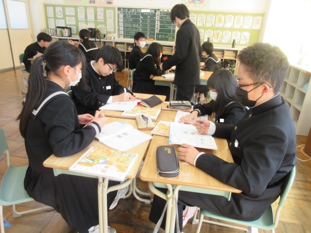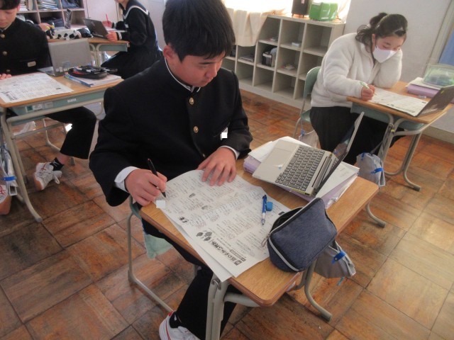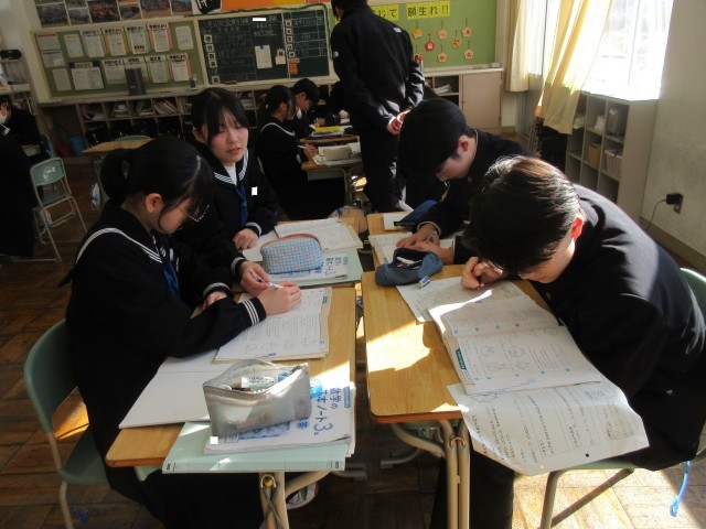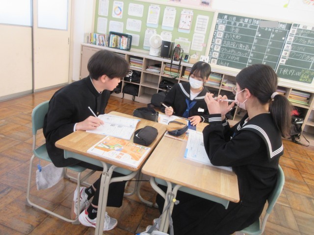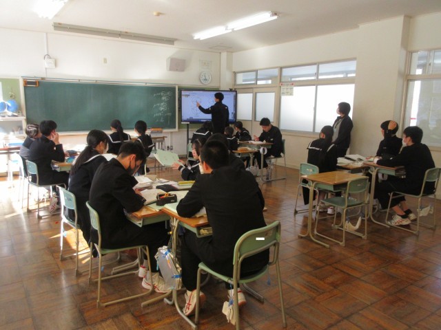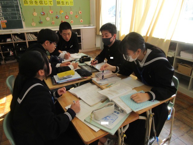 3年生も数学の授業ではグループになって「円周角」の問題を解き進めていました。つまずいた際には気軽にグループメンバーに尋ねることができる…そんな温かい雰囲気があります。「これ…どういう意味?」と困り感を示すと、近くのメンバーが手を止め、丁寧に説明をする様子も…。教えてもらった生徒からは「あっ、そういうことか!」と納得の声が聞こえてきました。この「教える」側の生徒ですが、自分の知識を整理して分かりやすくアウトプットする機会になり、自身の学びを深めることにつながるようです。これも学び合いの一つであり、「WinーWin」の関係と言えるでしょう。