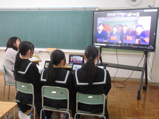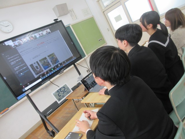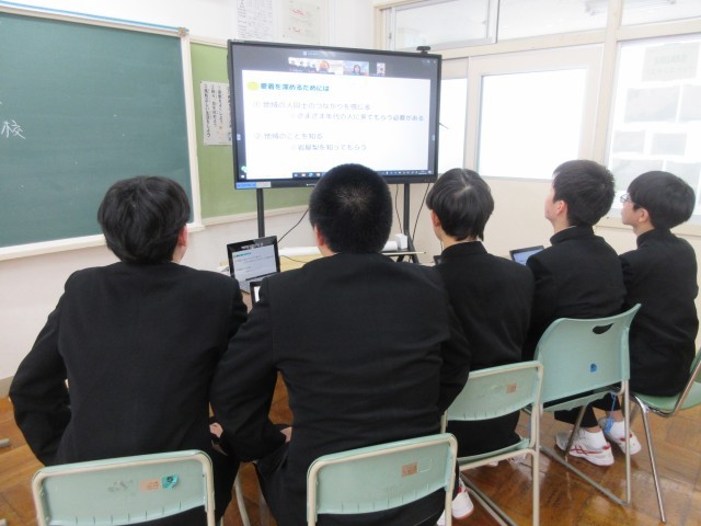 各チーム、これまで取り組んできた「ふるさと学習」において、地域のどんな課題に着目し、どんなテーマを掲げて、地域とどのように関わりながら課題解決に向かってきたのか…その探究の道のりを、同じグループになった他校(2~3校)の児童生徒にオンライン上で発信しました。発表時間は5分間。さすがに3年生は、保護者や1・2年生を前に発表してきた経験があるので、今回も要点を絞って端的にまとめた形でプレゼン発表することができました。一方、2年生も議会発表や近隣中学校とのオンライン交流の経験を生かし、堂々とした態度で発表することができました。